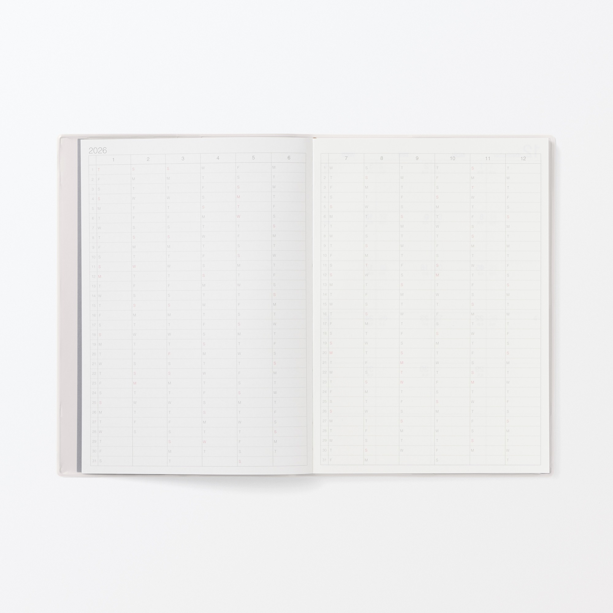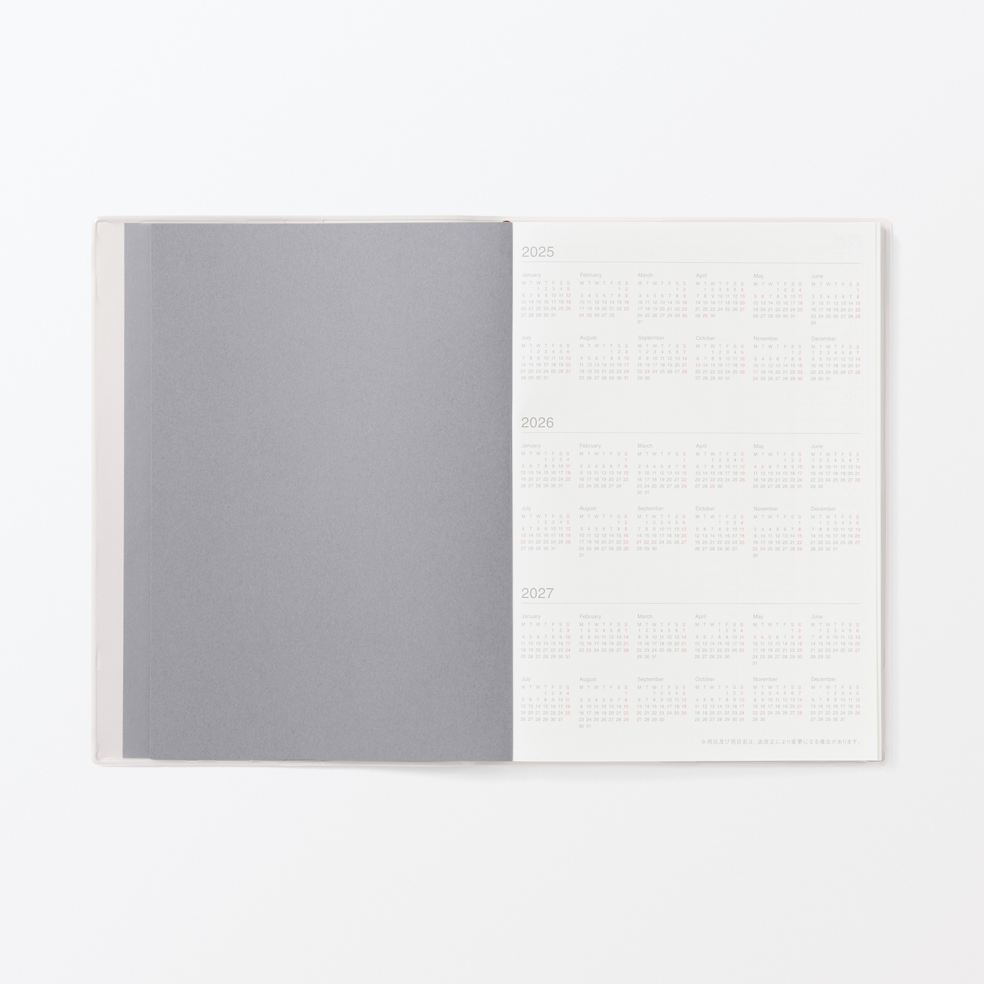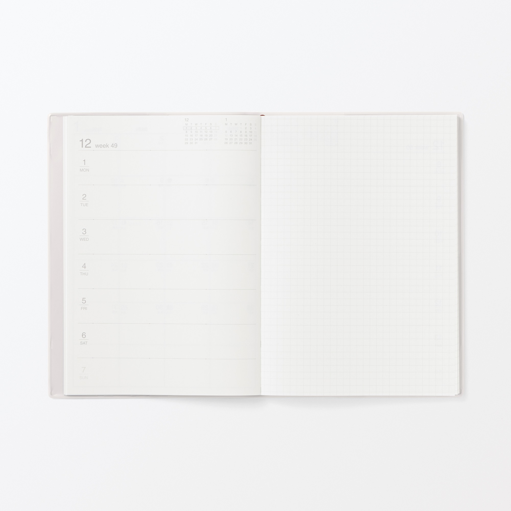 Stay organized with a Monday-start monthly and weekly spread calendar for planning ahead. Each week is laid out with your schedule on the left page and grid space for notes on the right. Includes a monthly grid view, a yearly key date spread, and extra grid pages for notes and a bookmark for easy reference.