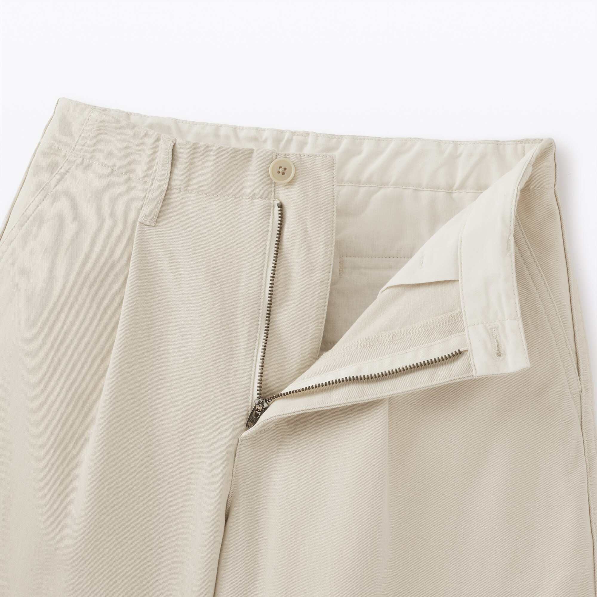 Made from slub yarn chino fabric for a textured, breathable feel. Designed with a wide fit and darted details for a flattering, structured silhouette. Long-length style, perfect for both casual and smart-casual outfits.